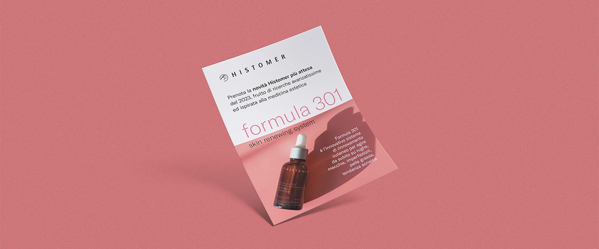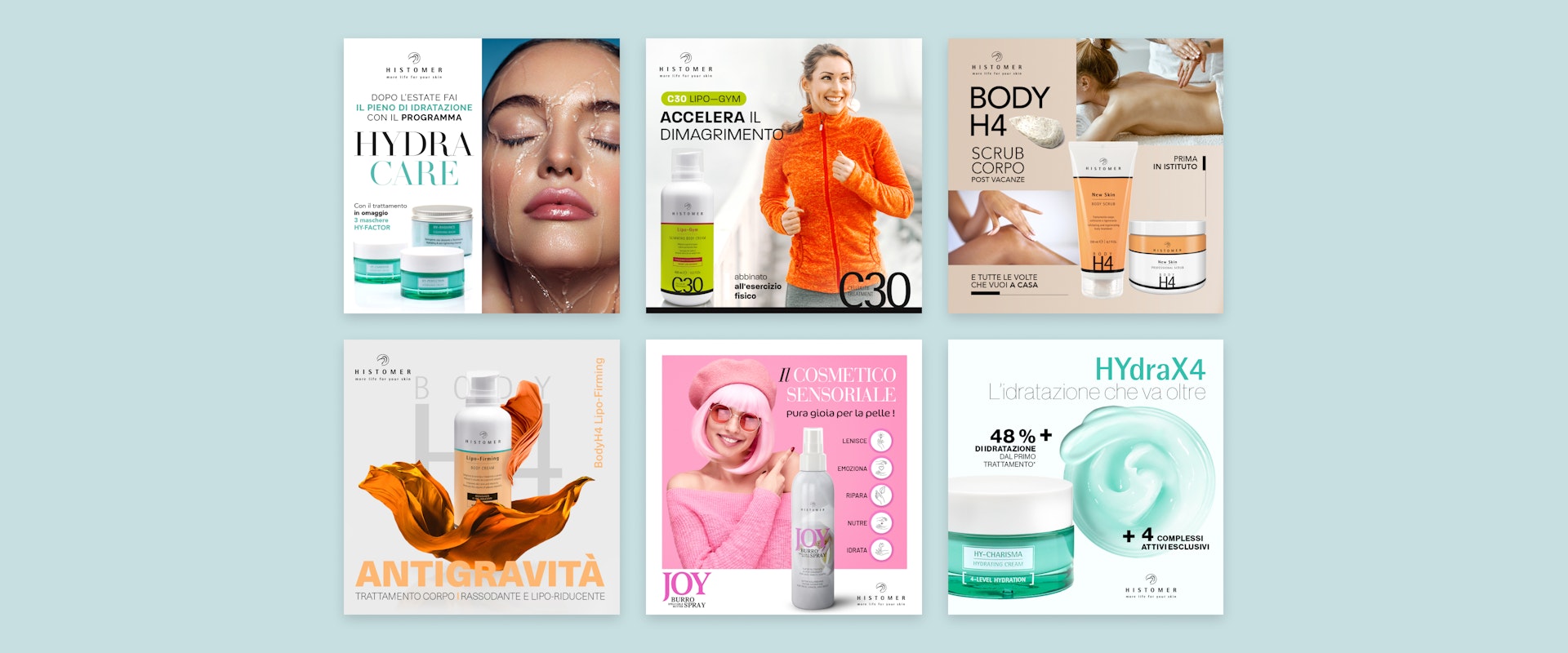 Oltre ad una nuova immagine per il pack, ci siamo occupati della realizzazione di moltissimi altri strumenti di comunicazione correlati. Dalle diverse brochure realizzate per i centri estetici agli espositori per il negozio, dai flyer alle shopper, dai rollup fino ad un originale canvas di vendita: l’estetica strategy. Uno strumento rivolto ai centri estetici e con un formato simile a quello di un tabloid, utilissimo per conoscere con anticipo i prodotti Histomer in arrivo e pianificare le attività di acquisto per i periodi dell’anno più intensi.
