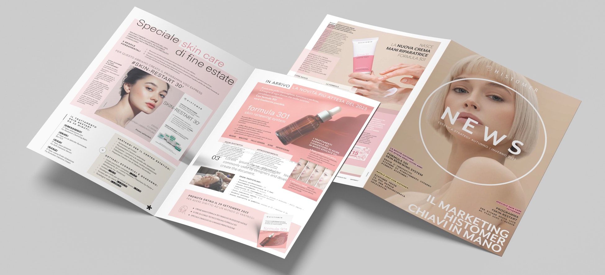 Oltre ad una nuova immagine per il pack, ci siamo occupati della realizzazione di moltissimi altri strumenti di comunicazione correlati. Dalle diverse brochure realizzate per i centri estetici agli espositori per il negozio, dai flyer alle shopper, dai rollup fino ad un originale canvas di vendita: l’estetica strategy. Uno strumento rivolto ai centri estetici e con un formato simile a quello di un tabloid, utilissimo per conoscere con anticipo i prodotti Histomer in arrivo e pianificare le attività di acquisto per i periodi dell’anno più intensi.